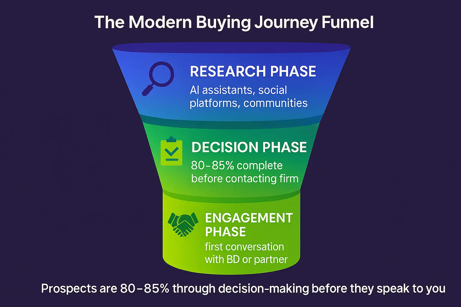 - Prospects are 80–85% through their decision-making process before they engage with a partner or BD professional.