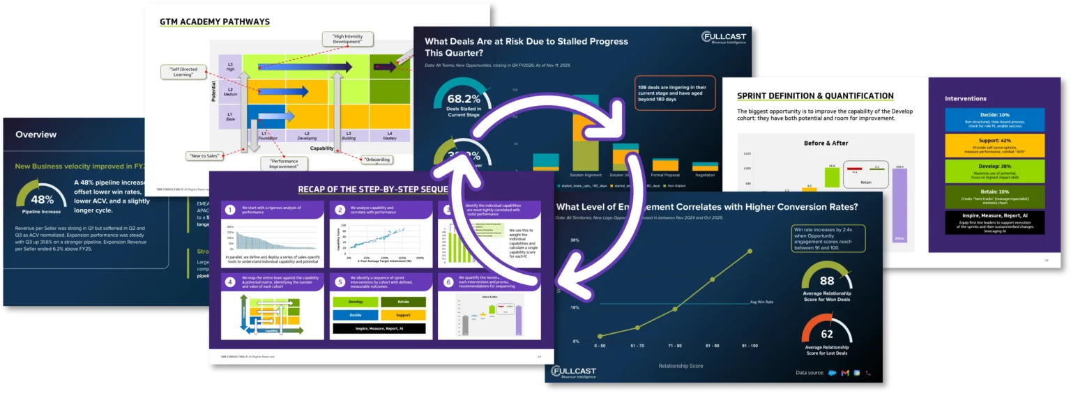 SBR capability sprints with Fullcast operational adjustments. Quarterly RIaaS for measurable performance lift. GTM CA reassessment for capability uplift and cohort movement.
